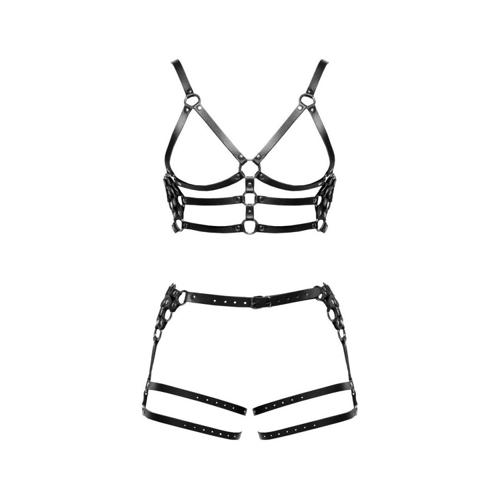 Robustes Harness-Set von ZADO aus schwarzen Lederriemen mit silberfarbenen Metalldetails. Bestehend aus Brust- und Hüft-Harness mit fest arretierten Schenkelriemen. Beide Teile sind vielfältig mit Schnallenverschlüssen für perfekte komfortable Passform verstellbar.