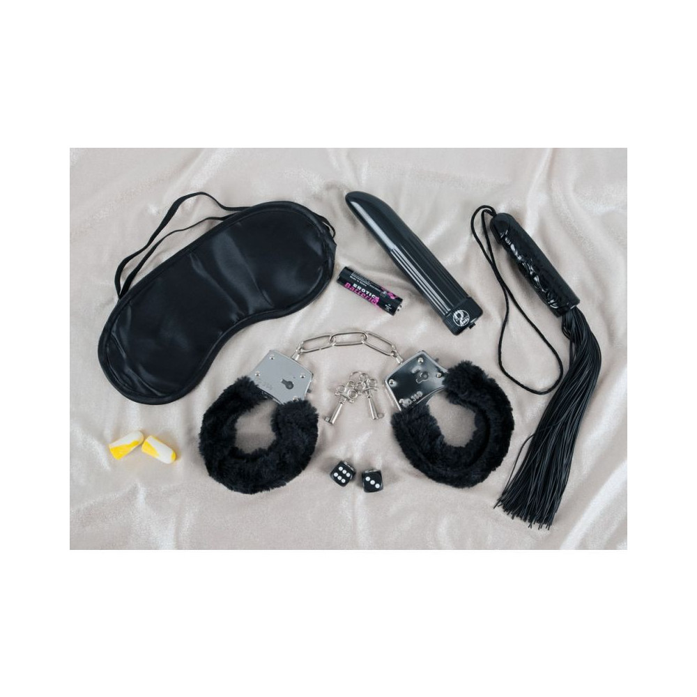 Soft-SM-Würfelspiel: In der deutschsprachigen Spielanleitung werden je Augenzahl der Würfel Aufgaben vorgegeben, z. B. Massieren, Knabbern, Peitschen etc. Inhalt: Peitsche, Augenmaske, Handschellen, 2 Würfel, Vibrator inkl. Batterie, Ohrstöpsel.