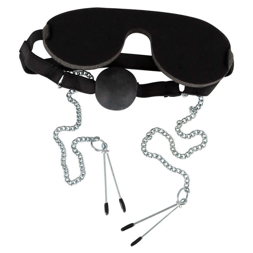 Augenmaske mit integriertem Mundknebel an dehnbarem Elastikband und verstellbare Nippelklemmen an Ketten. Schwarz. Ø Knebelball ca. 4 cm. Kettenlänge je ca. 30 cm. Klemmen je ca. 7 cm lang. Material: TPE, Metall (verchromt), PU, Polyester, phthalatfrei gemäß EU-Verordnung 1907/2006/EC.