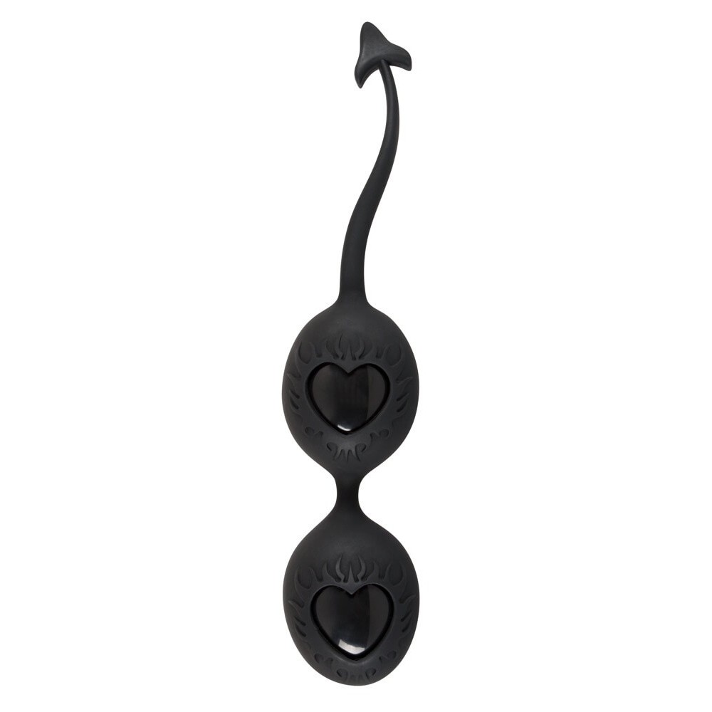 Schwarze Liebeskugeln mit weicher Silikonhülle und innen rotierenden Kugeln. Mit dehnbarem Rückholband. Gesamtlänge ca. 18 cm. Kugel-Ø je 3,6 cm. Material: Silikon, ABS, phthalatfrei gemäß EU-Verordnung 1907/2006/EC.